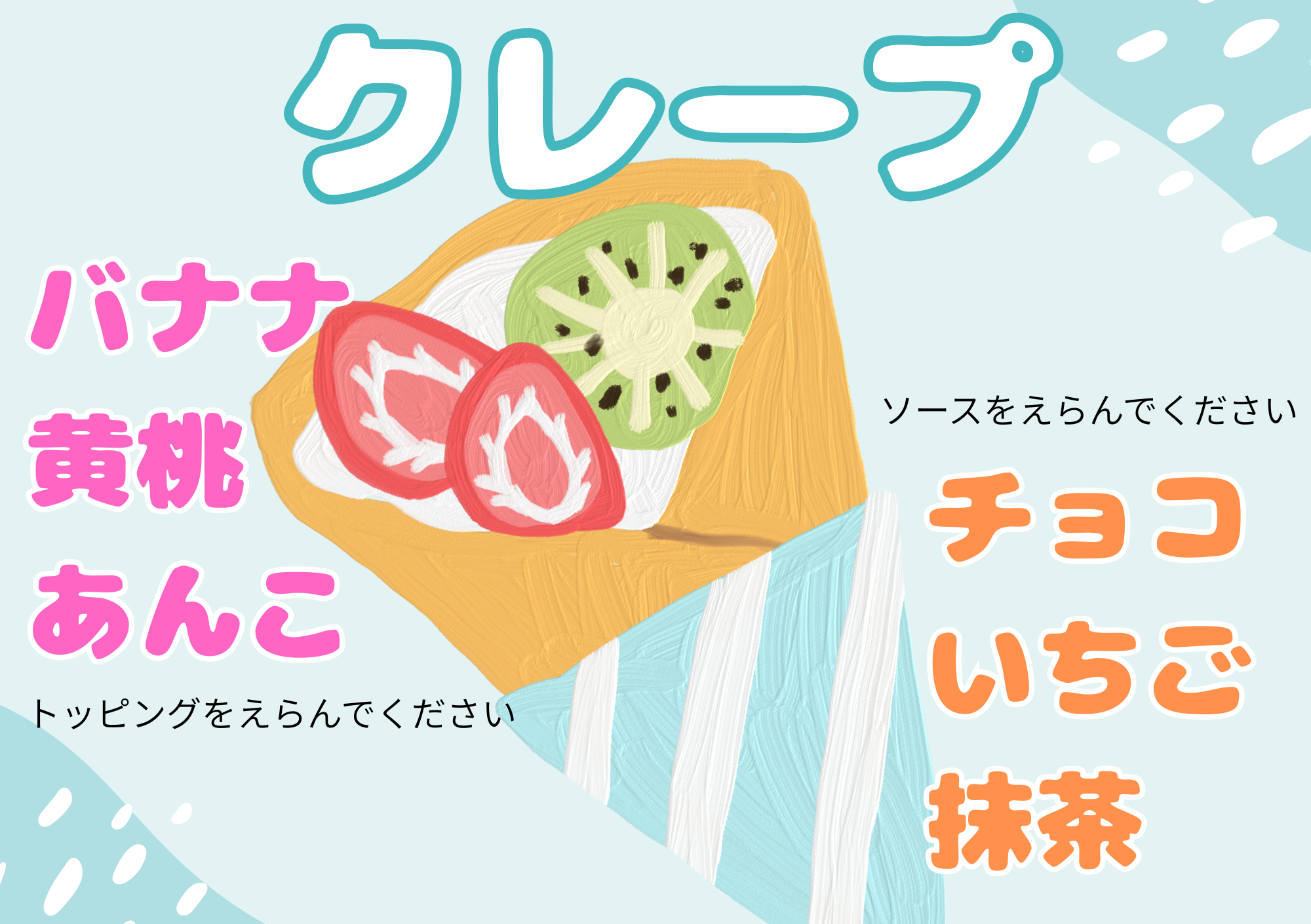抹茶に黄桃、あんこにチョコソース等いろんなクレープを選んでいただきました🎵