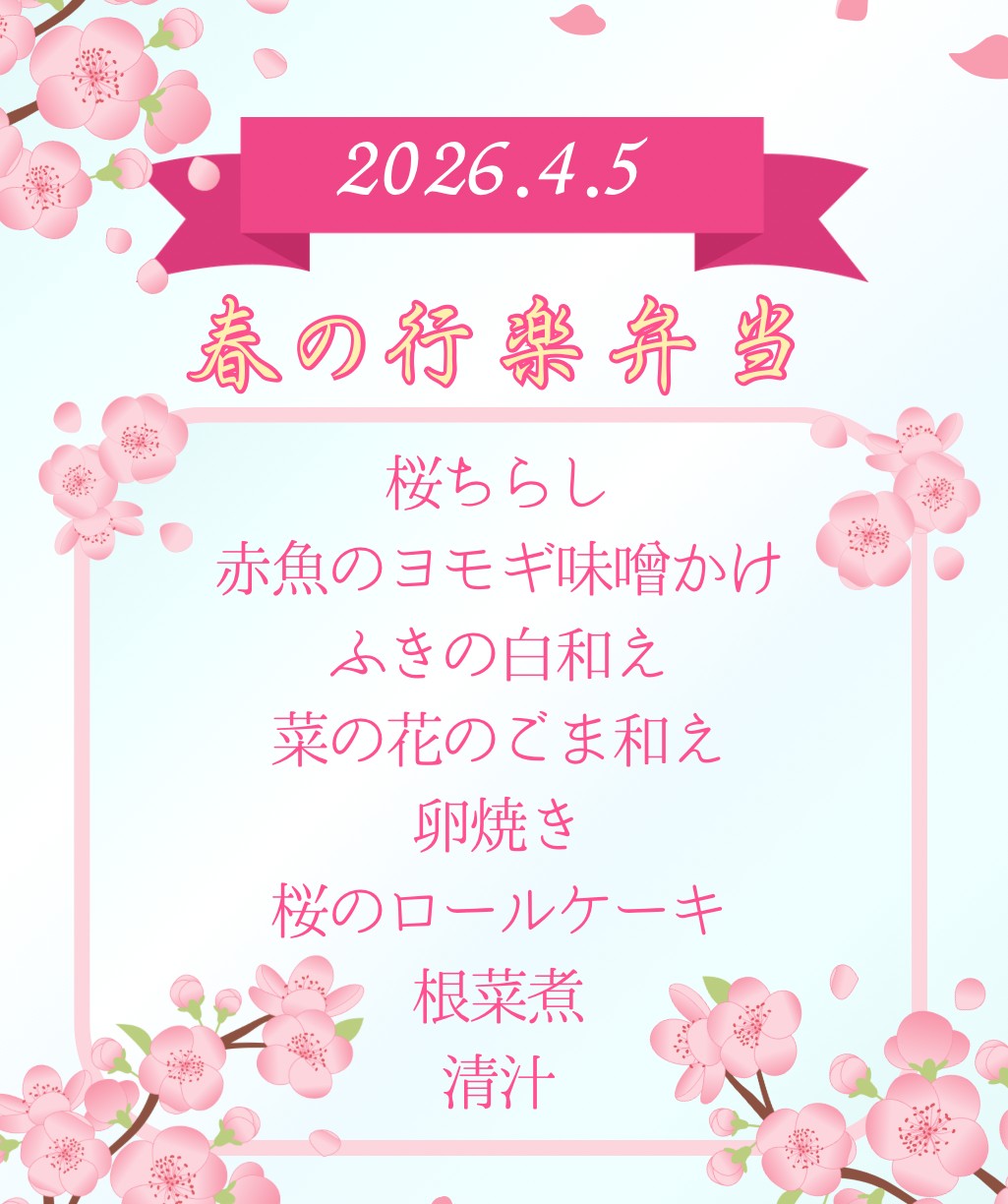 2026.4.5 (日) 🌸春の行楽弁当🌸 ブログ 給食事業部 桜が満開でとっても綺麗ですね🌸🍃 天気も良くお花見にぴったりな今日この頃、ケア・ラポート南風台のお客様へ 春の行楽弁当をご準備しましたよ🍱✨ 桜、ヨモギ、ふき、菜の花等、春の食材をたくさん詰め込みました😄 食事で春の訪れを感じていただけたら嬉しいです🌸🌸 南風台事業所 森 新着情報一覧