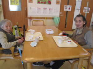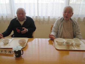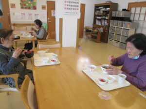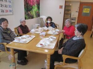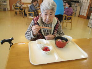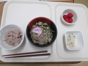 今日は一日でもあり、昼食はお赤飯です。それ以外にも鳥そば・大根サラダ・イチゴとなっています。