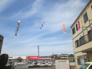 <室内にも春が・・・> <駐車場の上には鯉のぼりです> 「鯉のぼりよかですな~」